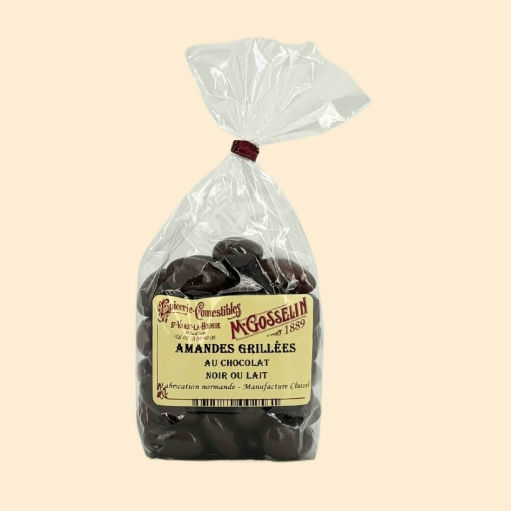 Ingrédients : cacao, amandes 34% minimum, sucre, beurre de cacao, lait entier en poudre, cacao, agent d’enrobage (gomme arabique, saccharose, sucre de glucose, shellac), émulsifiant (lécithine de colza), vanille bourbon en gousse.