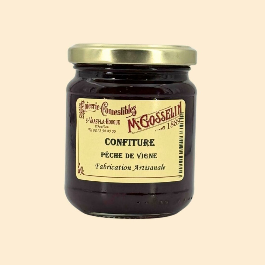 Ingrédients : pêche de vigne, sucre de canne, sirop de glucose fructose, gélifiant : pectine de fruits, jus de citron.