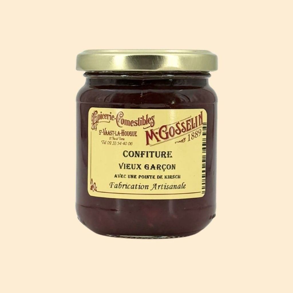 Ingrédients : framboise, abricot, griotte, poire, sucre de canne, sirop de glucose-fructose, gélifiant : pectine de fruits, jus de citron, kirsch.