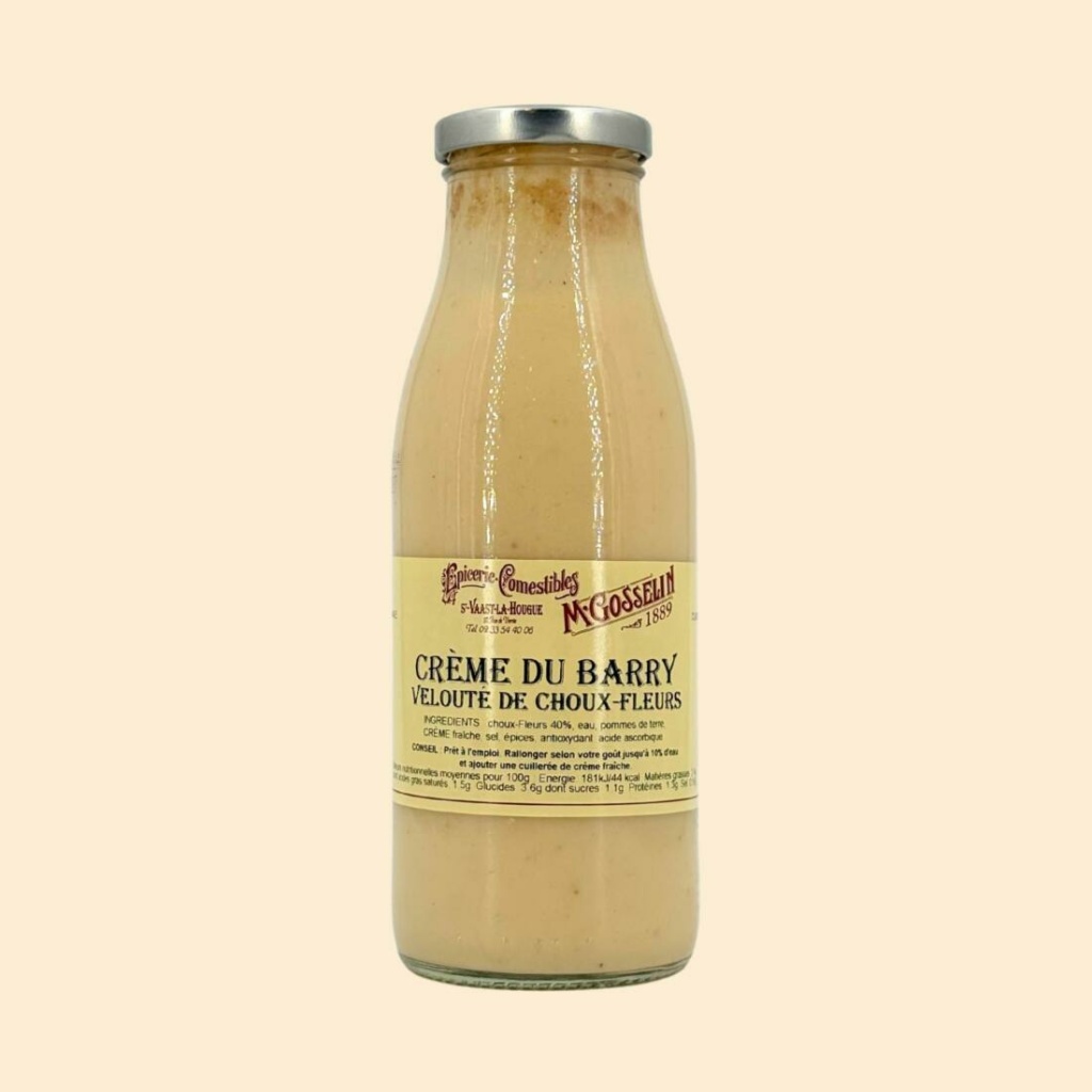 Ingrédients : choux fleurs 42%, eau, pomme de terre, crème fraîche, fécule de manioc, sel, épices.