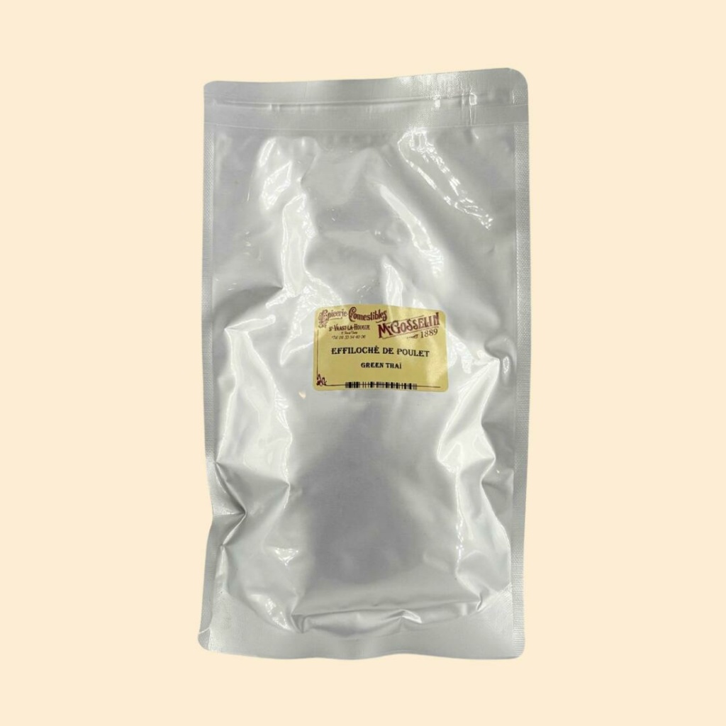 Ingrédients : viande de poulet 59% (origine France), crème, pâte green thaï 8% (piment vert jalapeno, échalote, galangal, sauce soja (eau, graines de soja 26%, blé, sel 17%), combawa, huile de colza, citronnelle, coriandre, ail, eau, concentré de citron jaune (concentré de citron, correcteur d’acidité : acide citrique, huile essentielle de citron), poivre, cumin, sel), sel.
