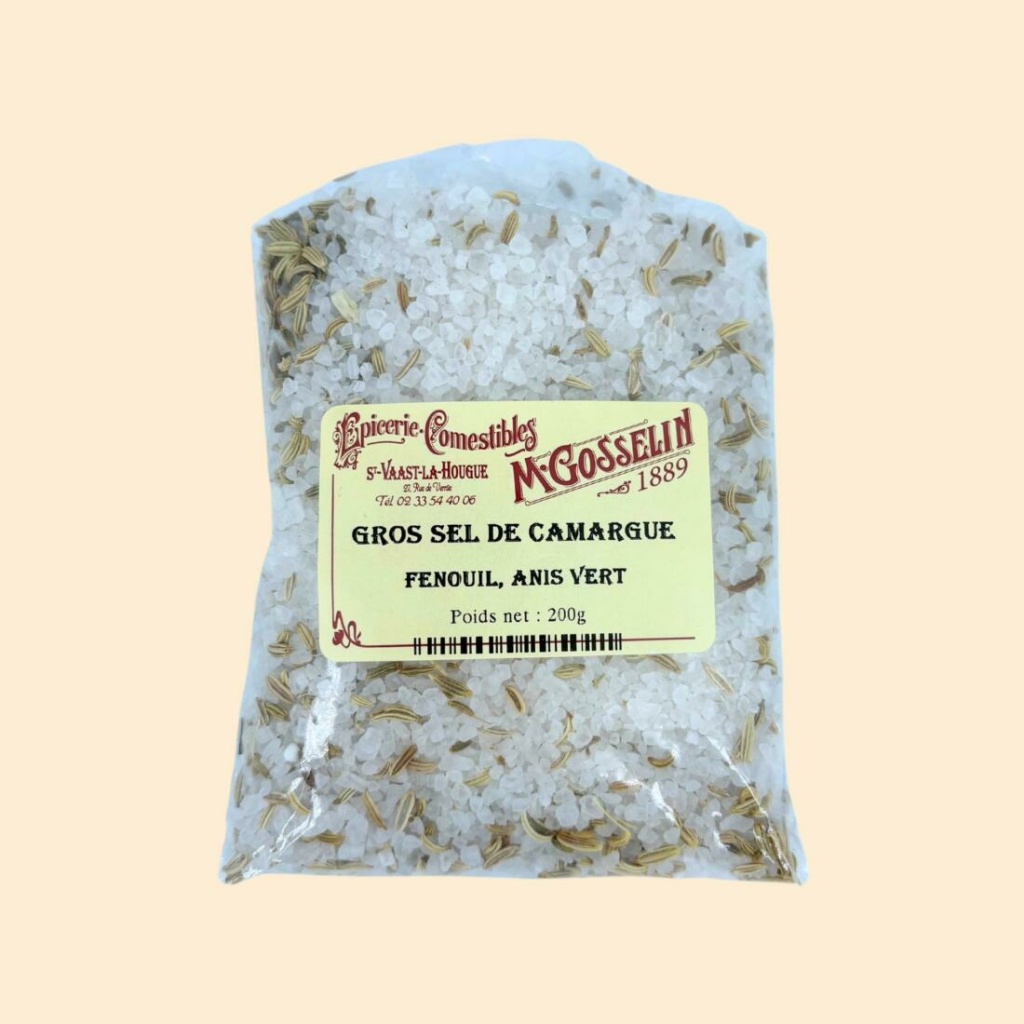 Ingrédients : Gros sel de mer de Camargue, anis vert 0,5%, fenouil 0,5%.