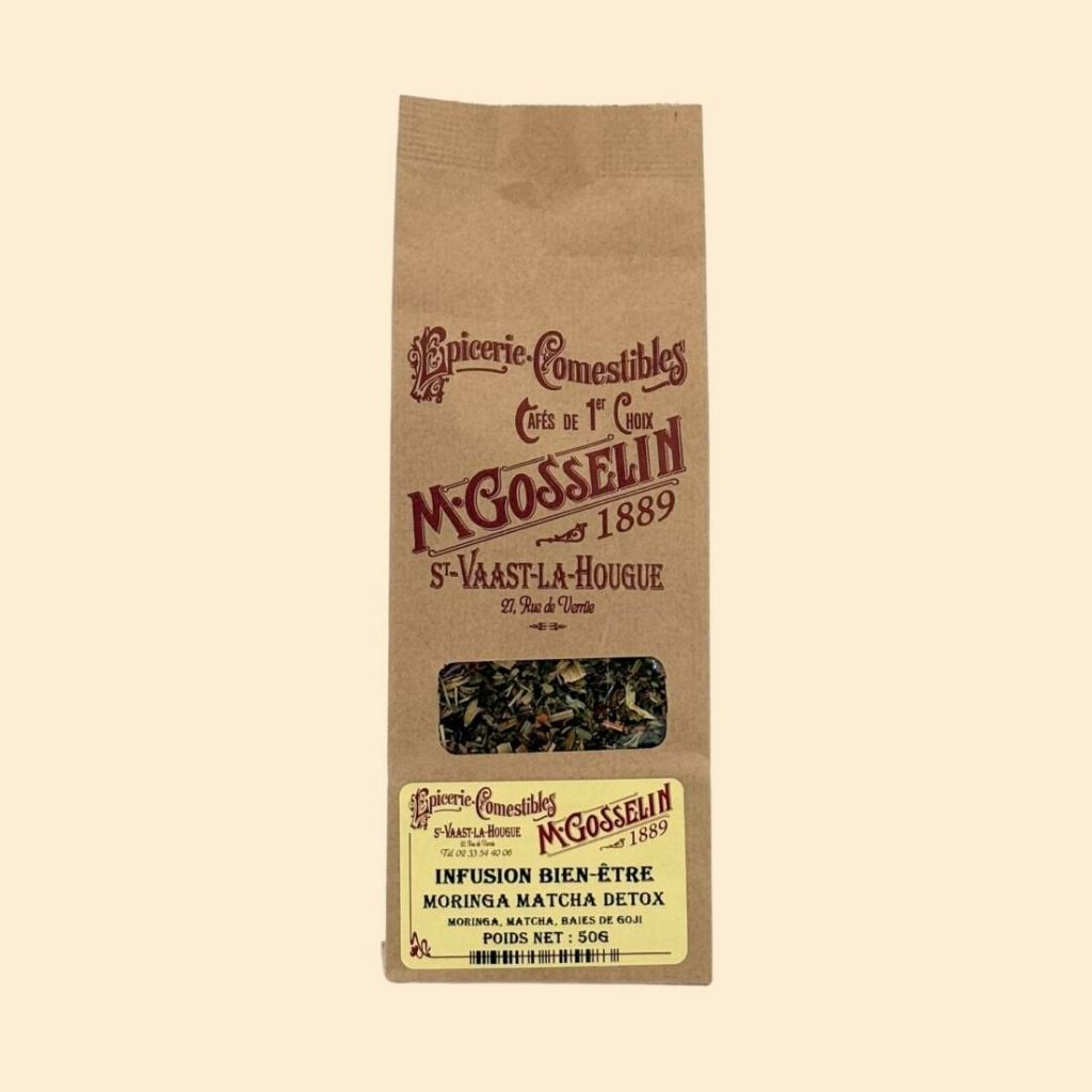 Ingrédients : Feuille de mélisse, orties, moringa, citronnelle, baies de goji, morceaux de pomme, feuille de souci jaune, pétales de roses, thé matcha.