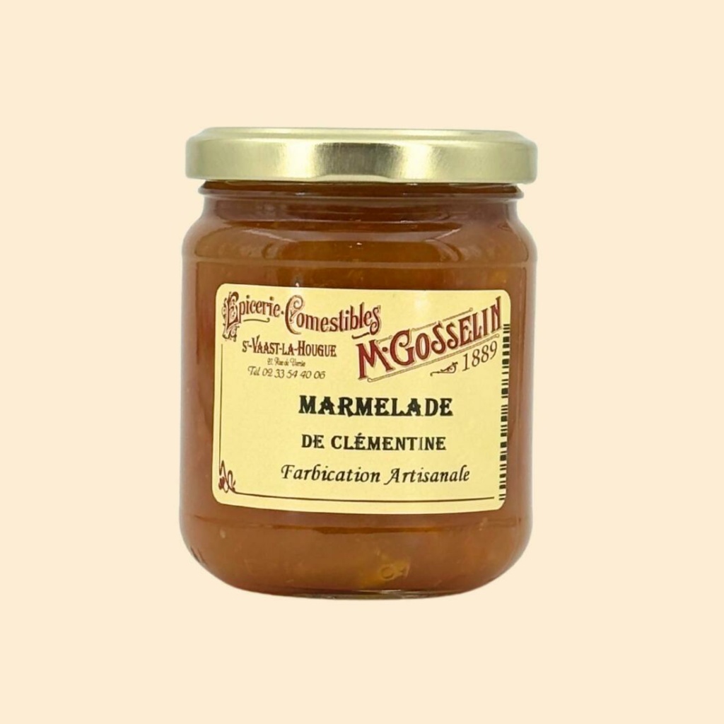 Ingrédients : clémentines, écorces coupées en lamelles fines, sucre de canne, sirop de glucose fructose, gélifiant : pectine de fruits, jus de citron.