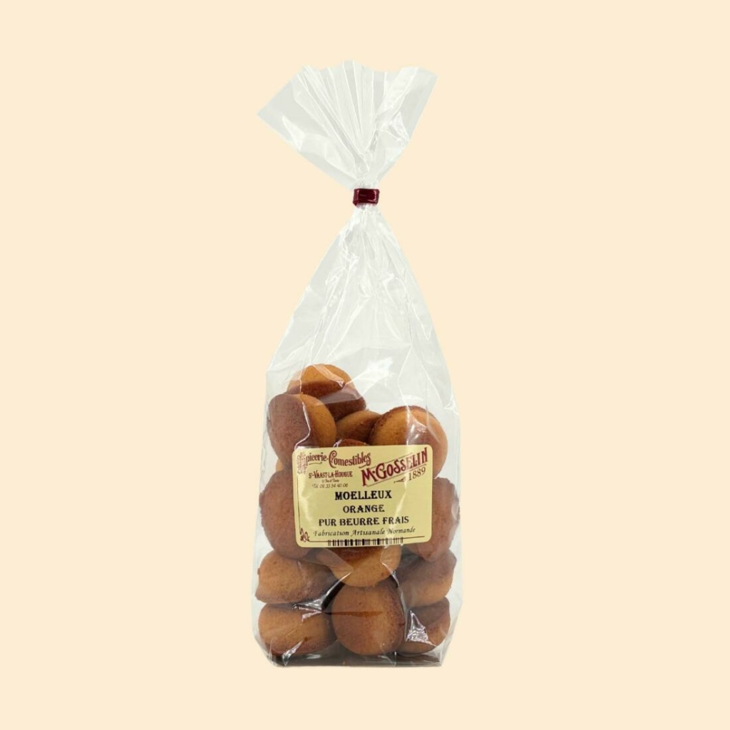 Ingrédients : sucre, blancs d’œufs, beurre frais, amandes poudre 12%, farine de blé (gluten), sucre inverti, huile essentielle d’orange.