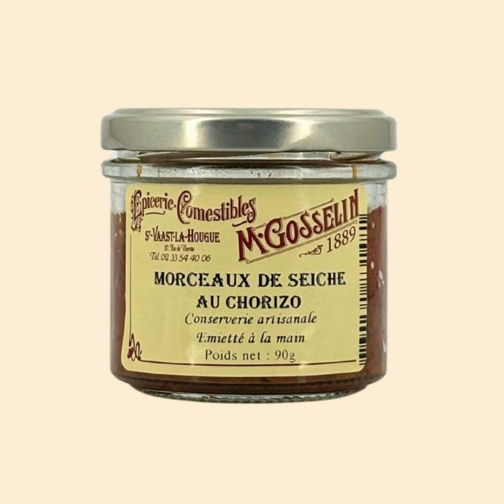 Ingrédients : seiche (sepiida vulgaris) 38,19%, tomate confite, chorizo doux 10,33%, coulis de tomate, échalotes, ail, persil, sel, agar agar, piment d’Espelette.
