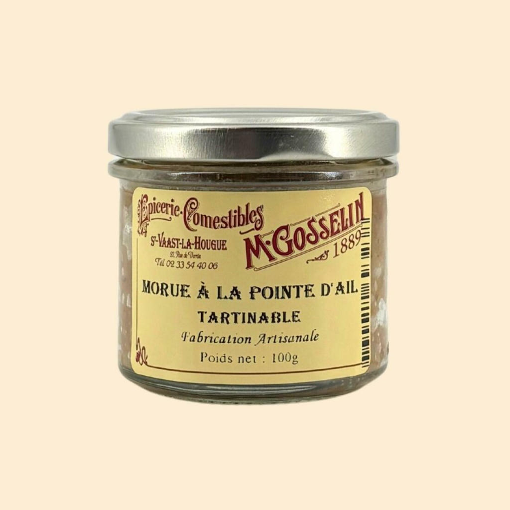 Ingrédients : morue dessalée 48%, oignons, échalotes, crème liquide (lait), ail 9,6%, vinaigre, amidon, persil, sel marin, huile de tournesol, thym, poivre, piment fort.