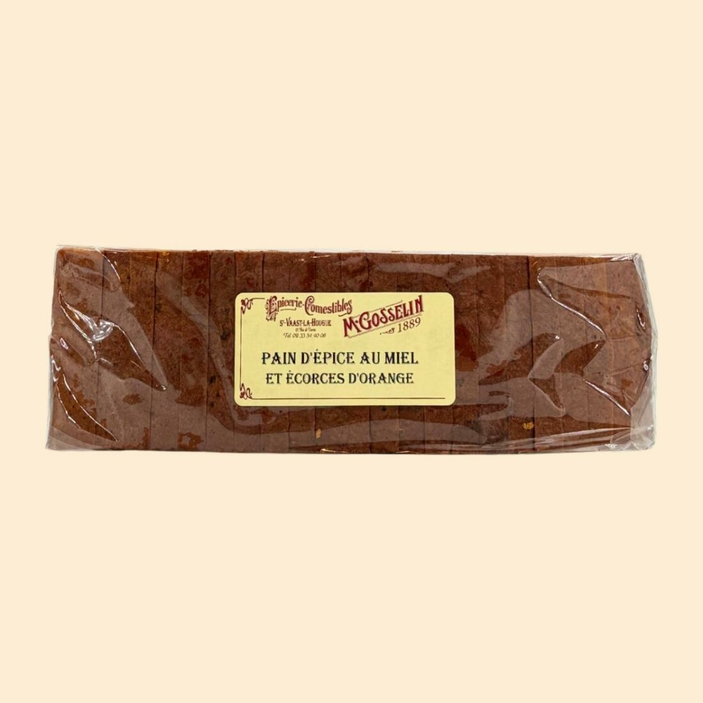 Ingrédients : farine de seigle, sirop de glucose fructose, miel 25%, écorces d’orange confites 12% (écorces d’orange, sirop de glucose fructose, sucre, régulateur d’acidité (acide citrique)), poudres à lever (carbonate acide de sodium, diphosphate disodique), arôme, épices.
