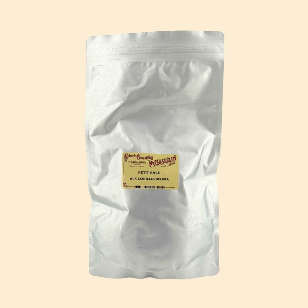 Ingrédients : eau, épaule de porc découennée désossée dégraissée fraîche 19%, poitrine de porc demi-sel 19% (poitrine de porc (origine France), saumure (eau, sel, conservateur : nitrite de sodium, dextrose, stabilisants triphosphate et diphosphates, antioxydant : érythorbate de sodium, arômes)), lentille beluga 12%, saucisse fumée (viande et gras de porc (origine France), eau, sel, poivre), vin blanc, carotte, oignon, poireau, fond de veau clair (arômes, sel, légumes (tomate, oignon, échalote), matière grasse animale, sirop de glucose, viande de veau 2,5%, épices, dextrose), concentré de tomate (tomate 99,5%, sel), huile d’olive, graisse de canard, beurre, ail, amidon de maïs, farine de blé, sel, persil, sucre, poivre, muscade, thym.