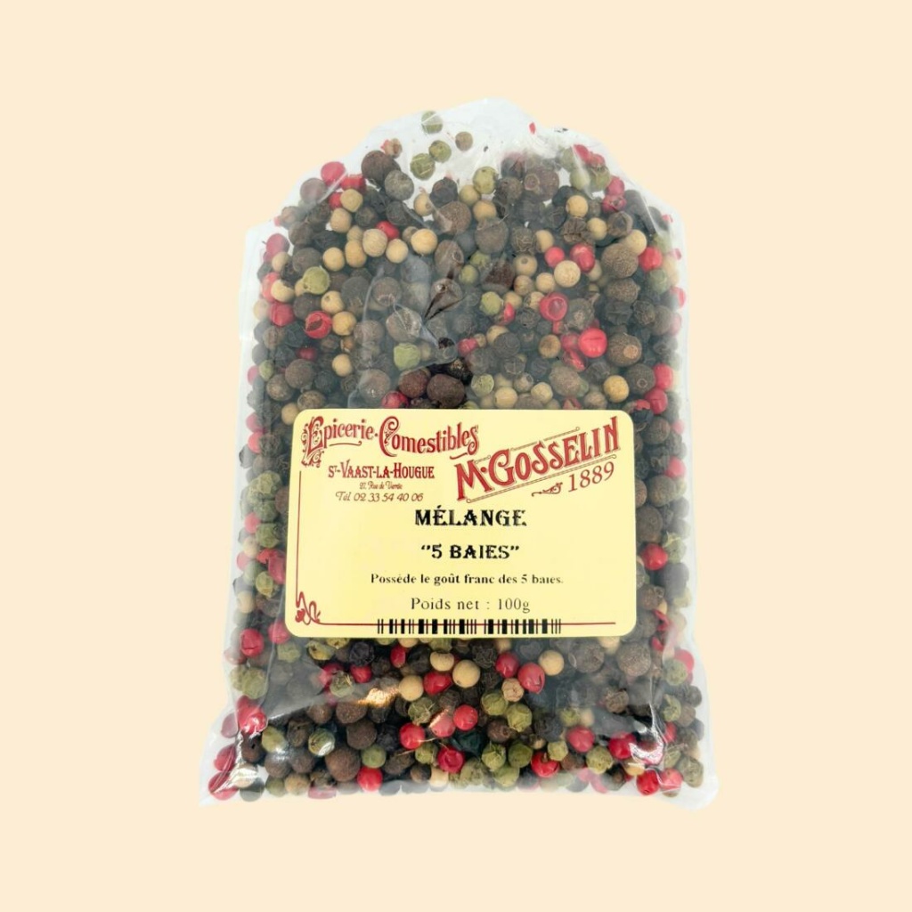 Ingrédients : poivre blanc Cameroun, poivre noir, piment de Jamaïque, baie rose, poivre vert.