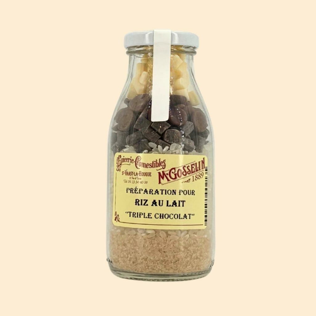Ingrédients : riz rond de l’UE, sucre roux Demerara, 16% de chocolat noir à 55% de cacao min (pâte de cacao, sucre, beurre de Cacao, émulsifiant : lécithine de soja, arôme naturel vanille) 9% chocolat au lait à 35% de cacao min (sucre, beurre de cacao, poudre de lait entier, émulsifiant : lécithine de soja, arôme naturel vanille), gousse de vanille.