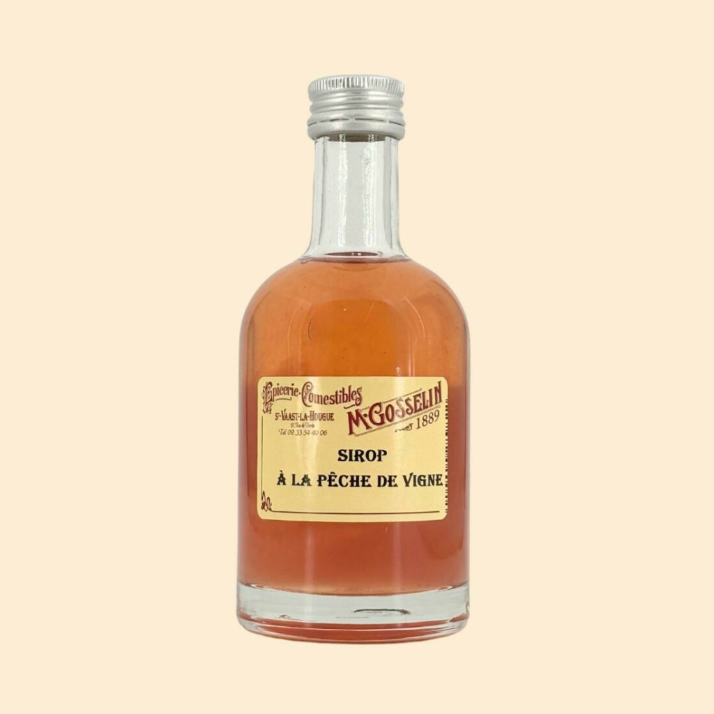Ingrédients : sucre de canne, eau, pêches de vigne 10%, arôme (pêche de Vigne) 0,3%, acidifiant : acide citrique.