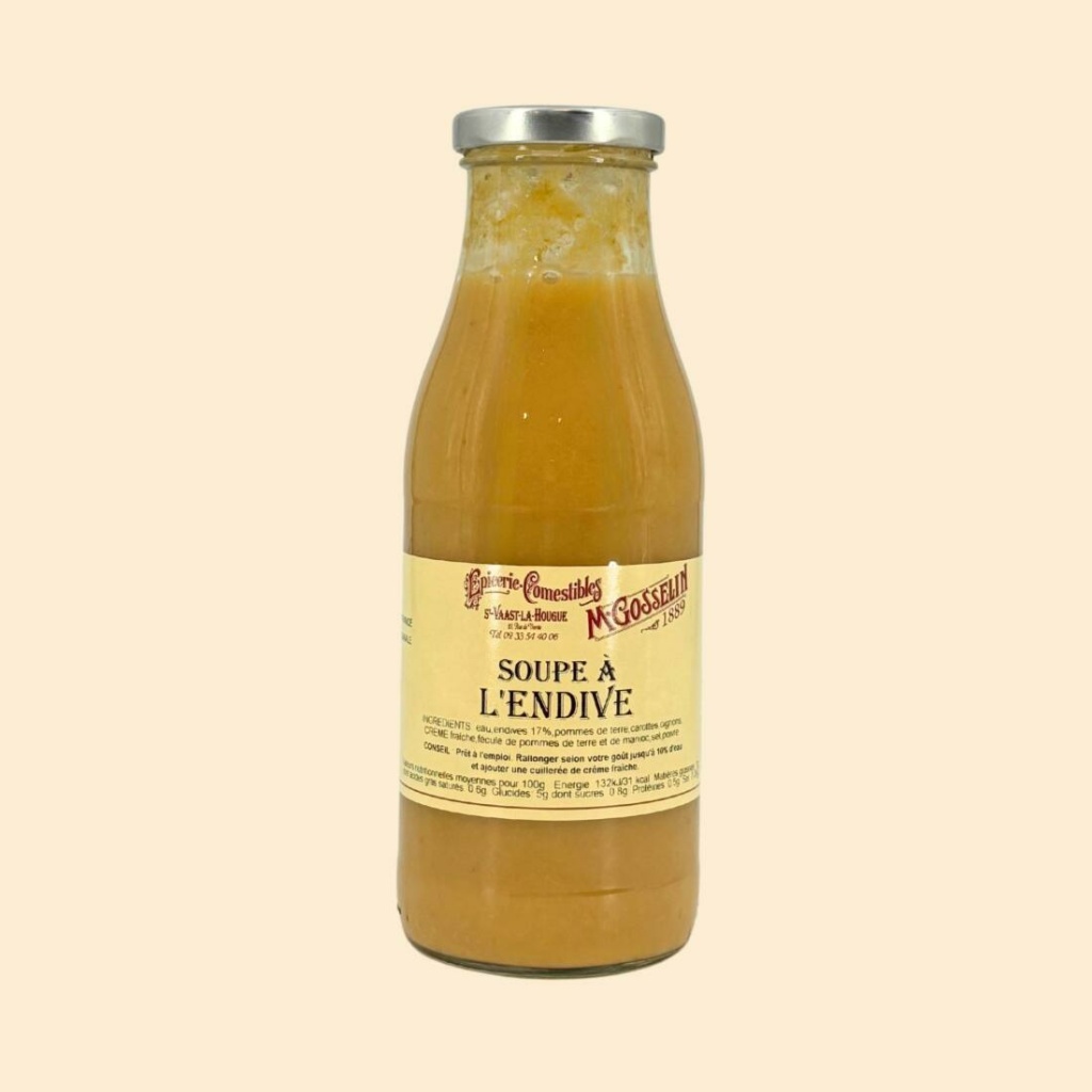 Ingrédients : eau, endives 17%, pommes de terre, carottes, oignons, crème fraîche, fécule de pommes de terre et de manioc, sel, poivre.