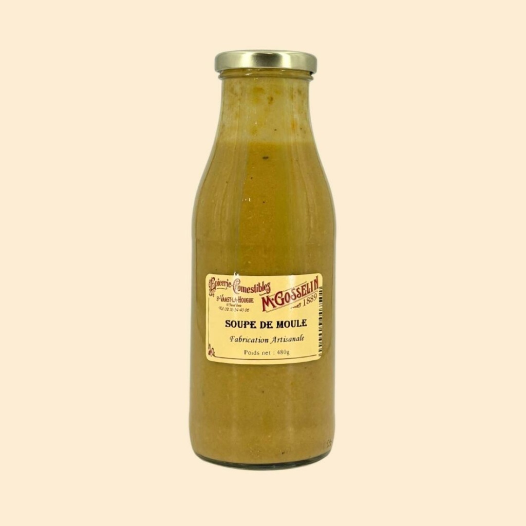 Ingrédients : eau, moules décoquillées cuites 11%, vin blanc (sulfites), huile de tournesol, lait écrémé reconstitué, amidon transformé de maïs, filet de poissons blanc, farine de blé, carottes, beurre, sel, cognac, poireau, poivre, céleri, laurier.