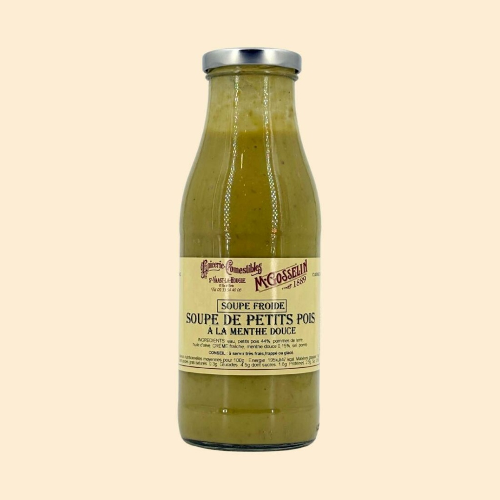 Ingrédients : petits pois 45%, eau, huile d’olive, crème fraîche, menthe douce 0,15%, fécule de manioc, sel, poivre.