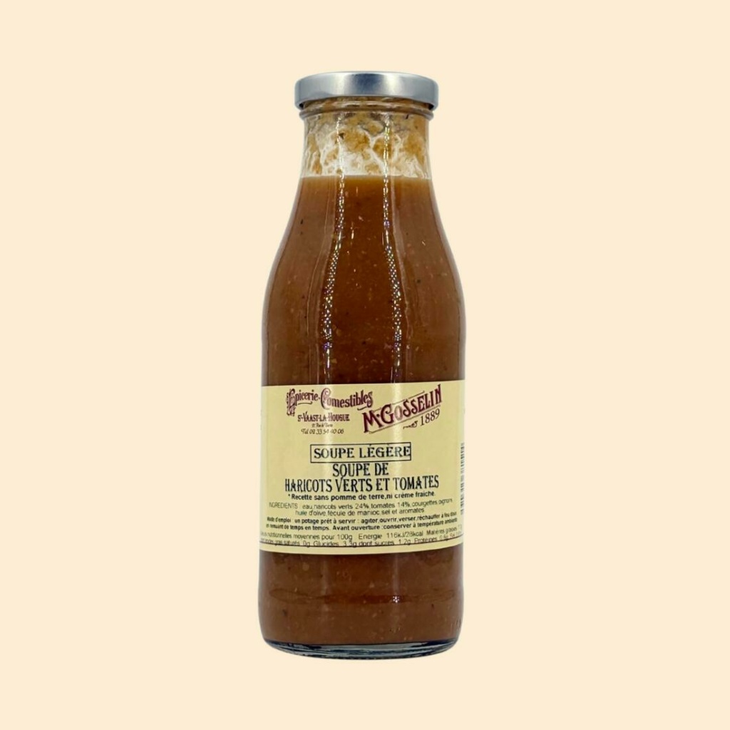 Ingrédients : eau, haricots verts 24%, tomates 14%, courgettes, oignons, huile d’olive, fécule de manioc, sel, aromates.