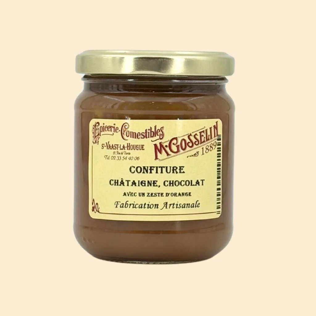 Ingrédients : châtaigne 42%, sucre de canne, sirop de glucose-fructose, chocolat 5% (70% cacao, sucre, beurre de cacao, émulsifiant : lécithine de soja, vanille naturelle), oranges 8%, gélifiant : pectine de fruit.
