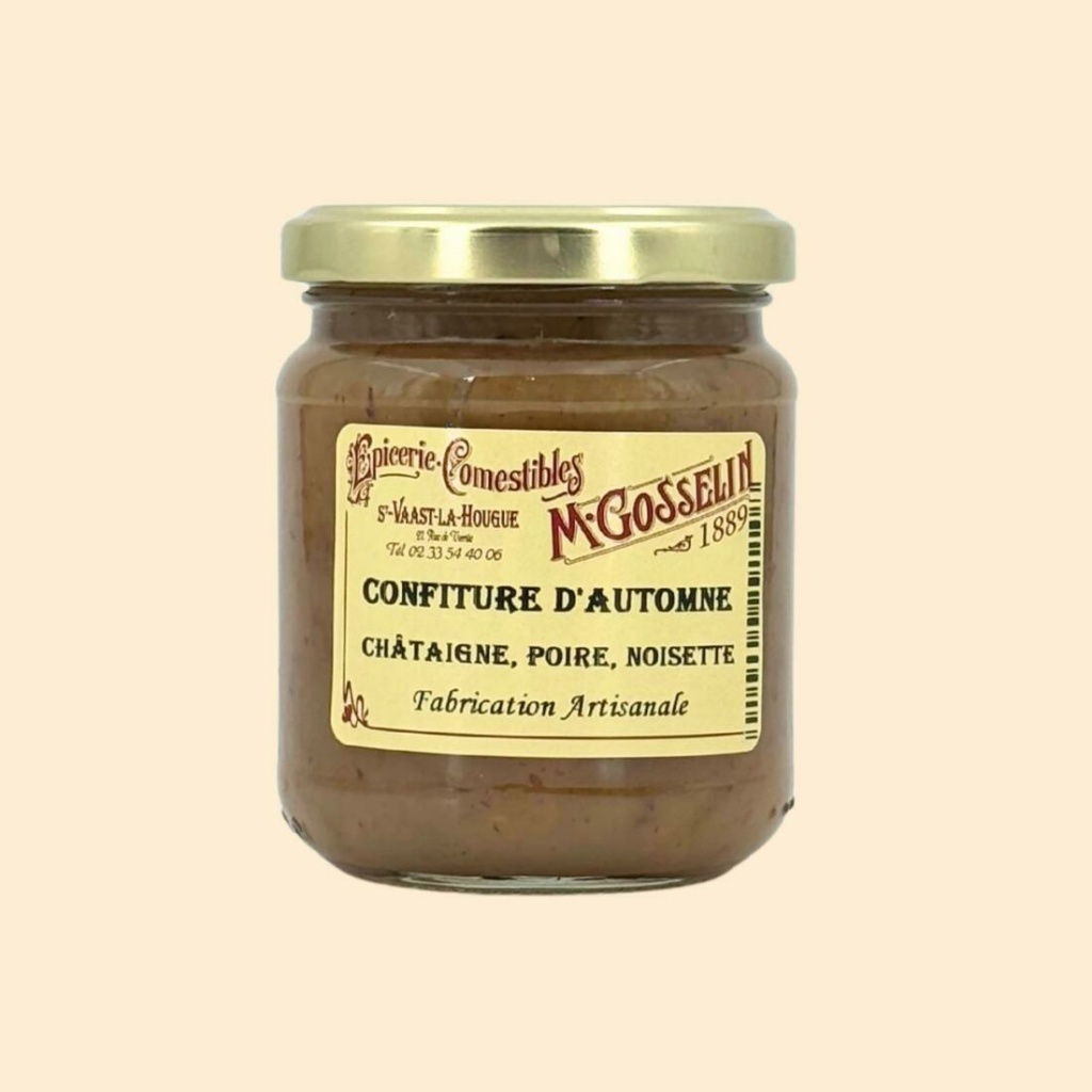 Ingrédients : châtaignes 25%, poires 15%, poudre de noisettes 15% (fruits à coques), sucre de canne, sirop de glucose- fructose, gélifiant : pectine de fruits.