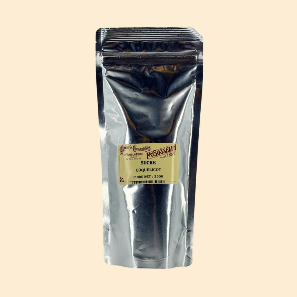 Ingrédients : sucre de canne non raffiné, arôme coquelicot 0,6%, pétales de coquelicot 0,2%.