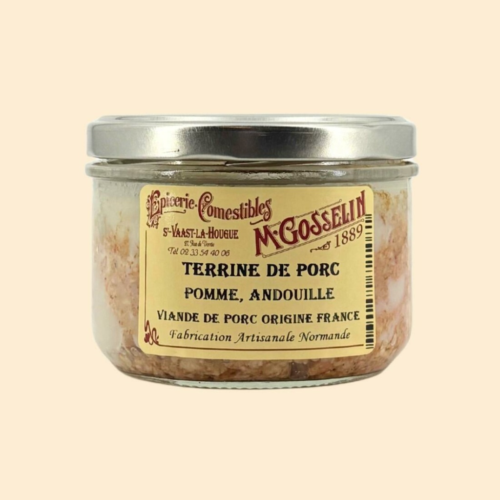 Ingrédients : viande de porc (origine France) 82%, andouille 8% (chaudin de porc, sel, poivre, boyau de boeuf), pomme cube 8%, sel, poivre.