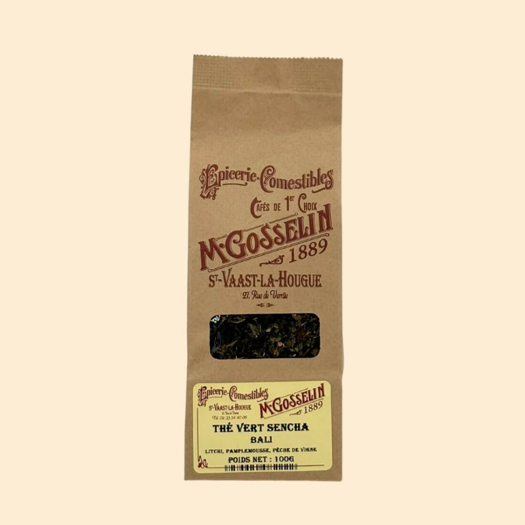 Ingrédients : thé vert Sencha, thé vert au jasmin, pétales de fleurs, arômes (litchi, pamplemousse, pêche de vigne) et huile essentielle de rose.