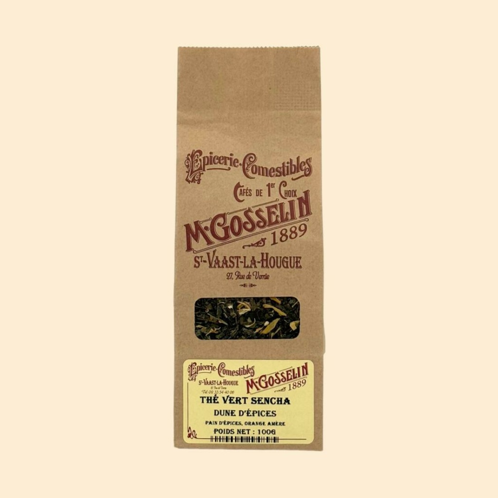 Ingrédients : thé vert sencha, écorces d’orange, arômes (pain d’épices, orange amère), pétales de fleur.