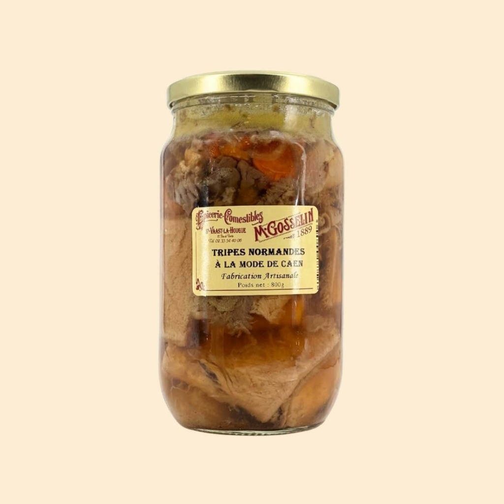 Ingrédients : estomac et pieds de bœuf 70% (viande origine France), jus de cuisson, carottes, oignons, sel, poivre, épices (céleri).