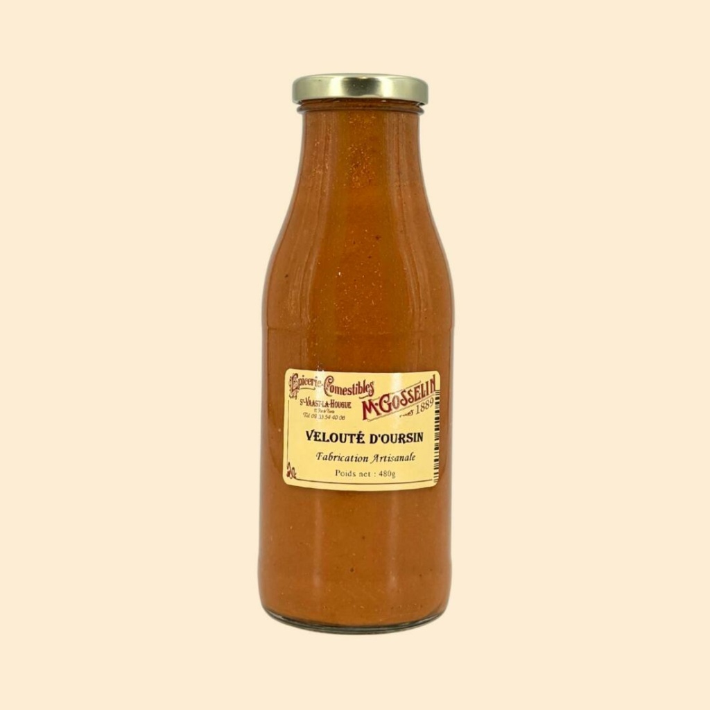 Ingrédients : eau, poissons, concentré de tomate, langoustine (sulfites), beurre, carottes, oignon, sel, corail d’oursin pur 1,3%, farine de blé, vin blanc (sulfites), amidon transformé de maïs, poireau, protéines de lait, épaississant : carraghénane, ail, fenouil, huile d’olive, herbes de Provence, poivre, safran.